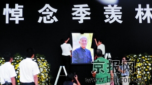 北京林業(yè)大學(xué)計(jì)算機(jī)系大一學(xué)生宋婷婷一大早就從學(xué)校趕來(lái),她手拿著相機(jī),希望記錄下送別季老的最后一刻!拔沂羌鞠壬睦相l(xiāng),一直特別崇拜季老,覺(jué)得他是一位可敬可愛(ài)的大師。”河南的大學(xué)生小張暑期來(lái)北京打工,今天也特地從朝陽(yáng)趕到了北大!疤痼@了,季老師的人格、學(xué)問(wèn)和愛(ài)國(guó)心一直深深感染著我,昨天聽(tīng)到他去世了,我一晚上都沒(méi)睡著,重新看了遍他的《牛棚雜憶》!闭f(shuō)這話時(shí),小張的眼圈紅了。他說(shuō),季先生是自己的偶像,季先生曾經(jīng)替北大學(xué)生看行李的事跡讓他甚是感動(dòng)。山西的賈先生今天特地從老家趕到北京來(lái)送別季老,“愿他一路走好,他永遠(yuǎn)是我們心中的大師!