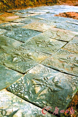 “已發(fā)掘的北面庭院鋪地磚的做工精美,反映了當(dāng)時高超的工藝水平和獨特的審美情趣。”李灶新說,這些磚每個邊長36厘米,表面的菱形方格內(nèi)飾四只飛舞的蝴蝶,邊角飾折枝牡丹!昂砻馈⑿蚊、色美,是美麗吉祥的象征。牡丹,雍容華貴,是富貴的象征。這兩種圖案裝飾的運用,體現(xiàn)出當(dāng)時人們對美好幸福生活的向往和對榮華富貴的追求。”