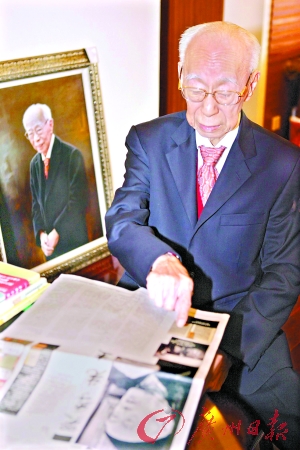 飯畢,饒公準(zhǔn)備回家。他年事已高,目前主要由女兒饒清芬照顧。饒女士為了父親身體,對老人“看管”得很嚴(yán),用大家的話說就是“嚴(yán)密保護(hù)”。記者在電梯追問饒老:“澳門回歸時,您繪百蓮圖;香港回歸、今年新中國成立六十周年,有沒打算準(zhǔn)備禮物送給祖國?”他微笑道:“一定會有的,到時再告訴你!我祝福國家興旺,全球和諧。”