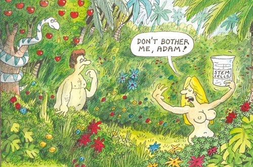 7月9 日,英國《太陽報》登出一張漫畫,在漫畫中,置身于伊甸園中的夏娃手持一只貼著“干細胞”標簽的燒杯,一臉傲慢地說:“亞當,請別煩我!”對事件的中心人物納伊尼亞教授而言,倫理上的質(zhì)疑和爭議似乎并沒有給他帶來什么困擾。他認為此項研究可以為那些想要孩子卻沒有能力的家庭帶去福音,而爭議則“完全可以通過法律最后進行規(guī)約”。面對紛至沓來的媒體,納伊尼亞教授仍沉浸在實驗成功所帶來的興奮之中:“這太令人興奮了!這些人造的精子有頭,有尾巴,也可以移動,它們具備能夠產(chǎn)生生命的一切特質(zhì)!”