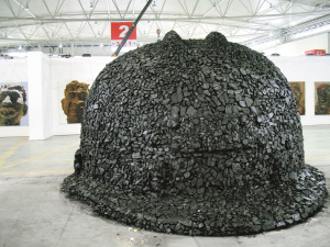 現(xiàn)場(chǎng)最扯眼球的作品是藝術(shù)家張建華的雕塑作品《礦工帽》。張建華說,這個(gè)礦工帽用了3噸煤塊貼滿,更像一座孤墳,他希望以此反映農(nóng)民工在社會(huì)發(fā)展過程中付出的沉重代價(jià)。