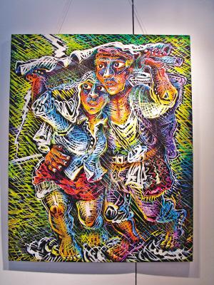 據(jù)介紹,在120位參展藝術(shù)家中,就有13位重慶藝術(shù)家,除了羅中立、傅文俊、李一凡三位參加主題展的藝術(shù)家外,還有10位來自川美的藝術(shù)家進(jìn)入了新人特區(qū)展。羅中立四幅最新力作首次展出也是雙年展另一個(gè)焦點(diǎn)。昨日,記者在現(xiàn)場(chǎng)看到,羅中立的四幅作品分別是《下梯的農(nóng)婦》、《過河系列一》、《吹燈》、《雷雨》,內(nèi)容都圍繞鄉(xiāng)村愛情。但在昨日的開幕儀式上,羅中立和陳丹青都因故沒有出席。
