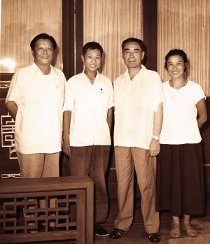1961年7月初,我們在北京工作的堂兄爾輝結(jié)婚,因為他祖母和母親都在淮安老家,伯伯和七媽為他們在西花廳舉辦了婚禮,飯前參加婚禮的三十多人一起照了相,我去晚了沒趕上。飯后,七媽拉住我說:“你來晚了,沒趕上照相,又要參軍走了,來和伯伯照個相吧!本S世姐姐說:“金山也來晚了,一起照吧!庇谑怯辛松厦娴倪@張照片。