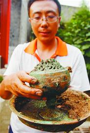 就在記者將要發(fā)稿時(shí),考古工地又傳來(lái)消息,在8月9日最新發(fā)掘的一座漢墓中,出土了幾件重量級(jí)文物:1件銅薰?fàn)t、1件鐵鼎和5個(gè)陶罐,另外在腐爛的棺木下面 還發(fā)現(xiàn)鋪有一層漢代五銖錢(qián),其中最為珍貴的是銅薰?fàn)t。銅薰?fàn)t分為上下兩部分,上為薰?fàn)t,鏤空,有花紋;下為一圓形銅盤(pán),直徑大約有30厘米,薰?fàn)t與銅盤(pán)可 以對(duì)插,連接后成為完整的銅薰?fàn)t,高度約為20厘米。
