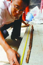 這次出土的幾件鐵器也引起了李銘的興趣。他告訴記者,別小看了這些鐵器,在漢代,這樣的鐵器屬于高檔品,不是一般人能用 的,更不是一般人能享受這樣的陪葬品的。這次出土的鐵器最重要的有3件。第一件是一柄鐵劍,已經(jīng)斷裂為5截,經(jīng)拼接后測(cè)量,其長(zhǎng)大約1.15米。雖然劍體 銹蝕嚴(yán)重,但依然能看出質(zhì)地優(yōu)良,制作講究。劍柄的造型還基本清晰,劍箍為青銅制作。從這柄劍上,我們可以推斷很多當(dāng)時(shí)的情況,如劍長(zhǎng)1.15米,比現(xiàn)在 一般的劍要長(zhǎng),這就說(shuō)明使用這柄劍的人身材比較高大;根據(jù)劍的形制,可初步認(rèn)定是濟(jì)南當(dāng)?shù)刂谱,如果通過(guò)科技手段研究出劍的鐵質(zhì)及其他合金含量,這對(duì)研究 漢代時(shí)期濟(jì)南地區(qū)的冶煉史有重要的參考價(jià)值。再說(shuō)鐵鼎和鐵釜,它們都是漢代時(shí)期的生活用具。其中,鐵鼎為雙耳三足折腹鼎,形狀很好。雖然現(xiàn)在看銹蝕嚴(yán)重, 但在當(dāng)時(shí)不是一般人家能夠使用的,不是官員,至少也是大戶人家,所以這對(duì)研究當(dāng)時(shí)的社會(huì)生活和陪葬習(xí)俗都有重要價(jià)值。
