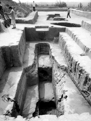 在元氏南白婁村的一處高地上,來自武漢大學(xué)的考古人員已經(jīng)在這里發(fā)掘了近一個(gè)月,他們的成果昨天展現(xiàn)在了記者面前,高地東面有20多個(gè)長(zhǎng)方形坑,坑不大,分布也沒規(guī)律,但大多是兩個(gè)一組;高地西面則有6座古代墓葬,它們呈南北方向,都有墓室、墓道,看著明顯比東邊的墓葬要?dú)馀,其中一個(gè)墓葬中還有具遺骸,頭沖東腳沖西。武漢大學(xué)考古教研室研究生宋海超告訴記者:“東面的是漢代墓群,兩個(gè)一組合葬比較多,都是夫妻,這里出土了成組的陶器,有豆、鼎和壺等,還有幾件彩繪陶器?梢钥闯霎(dāng)時(shí)的等級(jí)差別比較大。西面初步推斷是唐代墓,墓主人身份目前不清楚,但身份不低,不是平民百姓。”