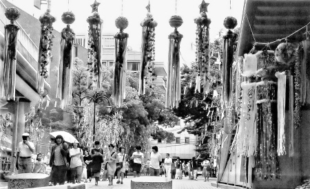 鳥住貞義先生還給我放了一段去年七夕時(shí),枚方市祭掃“七夕神社”的錄像,我看到,前往祭掃的人除了“七夕研究會(huì)”的成員外,還有當(dāng)?shù)氐淖h長(zhǎng)、市府官員以及許多民眾。在“七夕神社”的周圍栽了很多竹子,前往祭掃的大人小孩都將自己的心愿寫在一張長(zhǎng)紙條上,然后掛在竹子的枝條上,用來祈福。這使我想起日本小鈞市的“七夕文化”,也牽涉到兒童,“七夕”這天早上,凡年滿6歲的兒童在媽媽的陪同下,到野外的莊稼上取些露水回家,然后用露水磨墨寫字。這是一種儀式,代表兒童從這一天起,就開始啟蒙讀書寫字了。據(jù)我考證,這是日本和中國(guó)“七夕文化”略有不同的地方,其他如七夕夜放河燈,為牛郎與織女照明祝福;一家人在庭院里擺上桌子,沏上香茶,一邊品茶一邊觀看牛郎與織女相會(huì)天河的美景;在葡萄架下側(cè)耳傾聽牛郎與織女相會(huì)時(shí)的絮語;姑娘在絲瓜架下默默地向天上‘乞巧’,盼望自己能像織女那般心靈手巧,這些幾乎是相同的!跷/圖 湯禮春