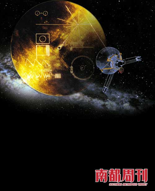兩艘“先驅(qū)者號(hào)”飛船上都安裝有一個(gè)金屬板,它可謂是地球人送給外星人的“名片”。金屬板的左側(cè)刻有太陽(yáng)系的圖案;右側(cè)刻有一個(gè)男人和一個(gè)女人的圖像,男人在招手致意;下方刻有太陽(yáng)及太陽(yáng)系九大行星的編碼。在兩艘“旅行者號(hào)”飛船上都裝有送給外星人的“郵包”:一個(gè)圓形鋁盒,里面放著一張鍍金視聽(tīng)光盤。讀取光盤數(shù)據(jù)的說(shuō)明寫在鋁盒的蓋子上。光盤上收錄了 115張圖片,介紹了地球文明最重要的一些資料 (如中國(guó)萬(wàn)里長(zhǎng)城、脫氧核糖核酸的分子式等);錄有地球人用 55種語(yǔ)言向外星人發(fā)出的簡(jiǎn)短問(wèn)候;存有 35種聲音信息;還有地球人的音樂(lè)文化(如巴赫的作品、爵士樂(lè)、中國(guó)名曲《高山流水》等)。