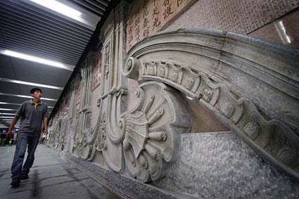 西單地區(qū)在上下行電梯頂部懸掛了《老字號》、《老北京》的浮雕作品,映襯了其“核心商業(yè)區(qū)”的地位。