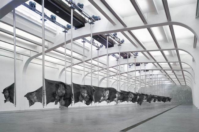 每天晚7點(diǎn)是尤倫斯當(dāng)代藝術(shù)館閉館的時(shí)間。大展廳里震耳欲聾地響了一整天的鼓風(fēng)機(jī)停了。34 幅被吹得呼啦啦飄揚(yáng)的旗幟以及旗幟上34 張嬰兒的臉也隨著風(fēng)力消失,癱軟下來(lái),耷拉在旗桿上。仿佛大退潮,展廳盡頭的灰色風(fēng)景墻露了出來(lái),那面墻上畫著沒有人煙的山頭。遠(yuǎn)望去,旗桿如墳?zāi)股系钠鞄茫椴迳降亍?/p>