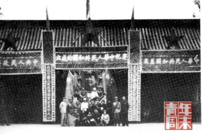 在《義勇軍進行曲》和禮炮聲中,毛主席按下電鈕,把第一面五星紅旗緩緩升起。 5000多只和平鴿沖向藍天。毛主席在天安門城樓上向全世界莊嚴宣告:“中華人民共和國中央人民政府今天成立了!睆V場上一片歡騰……