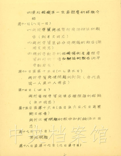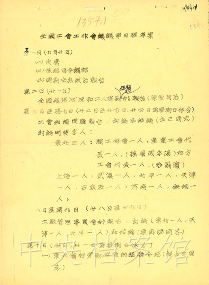 1949年7月23日至8月16日,全國工會工作會議在北平舉行。出席會議共有省、市、區(qū)72個單位的代表254名。毛澤東、朱德、周恩來等先后到會講話,李立三作了關于工會組織的報告。這次會議規(guī)定了當時全國工會工作的中心任務,就是在一年左右基本上把全國工人階級組織起來,以便在新中國的政權(quán)建設和經(jīng)濟建設中勝利地擔負起領導階級的歷史使命。會議通過了《關于勞資關系暫行處理辦法》等四個文件,明確了在新民主主義政權(quán)下處理勞資關系的正確途徑。