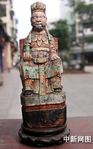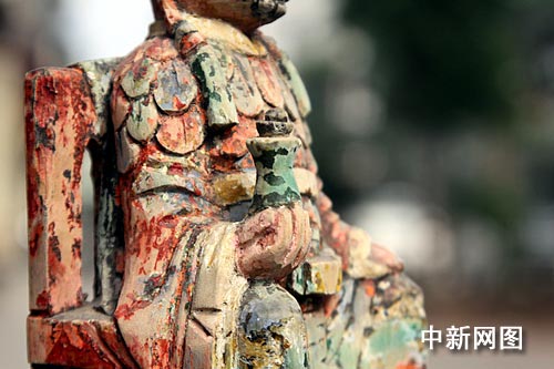 中新網(wǎng)成都9月28日電(劉龍泉)9月28日,記者在四川長寧縣城“永勝收藏館”里看到了一尊“酒圣公”木雕神像。該神像用柏木雕成,寬11厘米,相高22厘米,連座高30厘米;神像為男性,坐在太師椅上,頭戴孔明帽,眼睛大而突出,胡須濃密,一副文武兼?zhèn)涞臉幼。他的左手放在左大腿上,右手則向上持有一酒瓶,酒瓶上蓋有木塞。