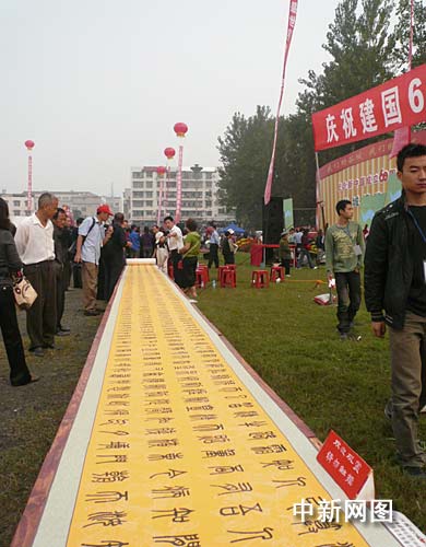 中新社襄樊9月29日電 (涂玉國)長一百一十米、寬零點八米,用五種字體書寫的毛主席詩詞的書法長卷,二十九日在湖北省襄樊市谷城縣博覽會上現(xiàn)身。這是該縣文化館副館長、書法美術家協(xié)會主席許祥強為慶祝新中國成立六十周年而作。