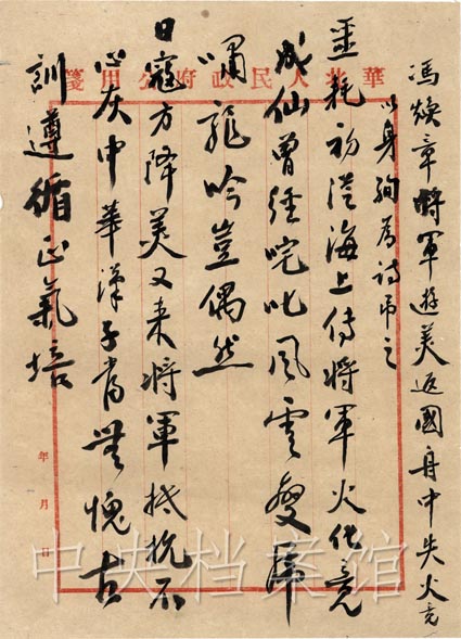 馮玉祥( 1882~ 1948)字煥章,安徽巢縣(今巢湖市)人,愛國(guó)將領(lǐng)。 1946年 9月赴美國(guó)考察, 1948年7月響應(yīng)中國(guó)共產(chǎn)黨號(hào)召,動(dòng)身回國(guó)參加新政協(xié)籌備工作, 9月 1日因回國(guó)客輪在敖德薩港附近的黑海海面失火遇難。他的遇難震驚了中外,中共中央主席毛澤東和中國(guó)人民解放軍總司令朱德向馮玉祥夫人發(fā)出唁電: “驚悉馮先生及令媛不幸遇難,至深痛悼,馮先生置身民主,功在國(guó)家。尚希勉抑哀思,并為實(shí)現(xiàn)馮先生遺志而奮斗。”