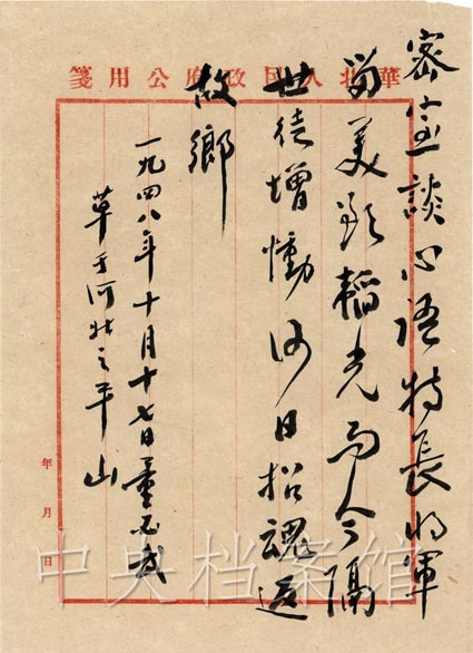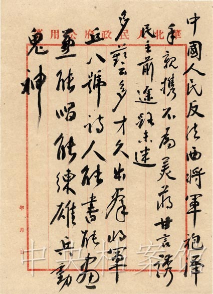 1949年 9月 1日,馮玉祥遇難周年祭日追悼會(huì)在北京舉行,出席者有李濟(jì)深、宋慶齡、周恩來(lái)、沈鈞儒、張瀾、何香凝、郭沫若、林伯渠、吳玉章、董必武及馮玉祥夫人李德全等 600余人。毛澤東、朱德及各民主黨派、各人民團(tuán)體送了挽聯(lián)花圈。毛澤東親筆題詞: “馮玉祥將軍逝世周年紀(jì)念謹(jǐn)致悼意。 ”周恩來(lái)在致詞中說:馮玉祥先生從一個(gè)典型的舊軍人轉(zhuǎn)變成為一個(gè)民主的軍人,他經(jīng)過了曲折的道路,最后走向新民主主義的中國(guó)。馮先生堅(jiān)決地拒絕了美帝國(guó)主義對(duì)他的誘惑,毅然離美準(zhǔn)備回到中國(guó)解放區(qū),接受參加新政治協(xié)商會(huì)議的號(hào)召,不幸遇難,實(shí)值得大家紀(jì)念。