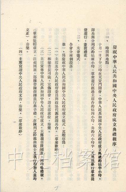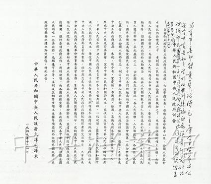 毛澤東主席莊嚴(yán)宣布:“中華人民共和國中央人民政府已于本日成立了!辈⑶矣H手升起國旗——五星紅旗。升旗儀式后,毛澤東宣讀《中華人民共和國中央人民政府公告》。