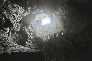 最吸引劉冬故地重游的是,洞內(nèi)除那個200多平方米的空間讓人無限暇想外,旁邊石壁開鑿、用于支撐木板建樓的石孔讓人嘆為觀止:石孔有30多個,從洞壁這端呼應(yīng)另一端,跨度超過30米。如此遠(yuǎn)的距離,古時建樓常用的材料——木棒,是如何解決受力和加固等建筑難題的?劉想不明白,更無法得知當(dāng)時洞內(nèi)小樓模樣。