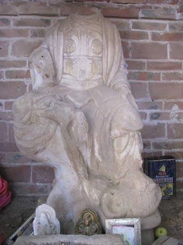 據國家文物局網站消息,該造像砂石圓雕,頭已殘失,高120厘米,寬65厘米,厚50厘米,坐于樹根狀座上,左腿自然下垂,跣足踏一類似玄武的物體,左手平置于左膝,右腿上屈置于座面上,右腳殘缺。坐姿類似于觀音的游戲坐,披發(fā)跣足,外著大衣,內著鎧甲,胸部為人字形護心鏡,胸系絆帶,腰扎英雄巾。座后方刻凌亂文字數行,大多已漫漶不可辨識,依稀可見“神□七年”、“正大二□”等。