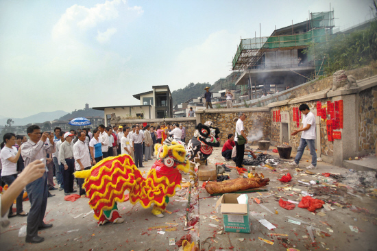 古墓前站滿了各地前來(lái)祭祖的男女老少,更有許多人一大早從廣西岑溪趕來(lái),祭祖的儀式熱鬧而有序,舞獅在伴奏之下騰挪起伏,而曾氏后裔也有序地上前行禮敬香,人們?cè)诎菁乐笥行螂x開。