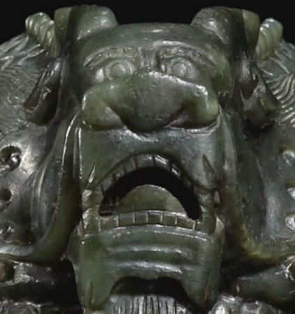 李教授同時指出此次拍賣的“八徵耄念之寶”印龍爪、頭部紋飾雕工疲弱而少章法、刀法。龍的發(fā)紋不上沖,火焰紋并不上揚(yáng),龍爪粗野乏力、沒有抓力,缺乏動感,似走獸類臥伏在地面一般,龍脊拱沿處造型用,用刀不干凈表現(xiàn)無弧勢,顯出臃腫、毫無生氣,因造型力度沒把握好,鼻部中軸整塊竟不居眼、口正中,電腦圖片放大后看到門牙和邊牙竟上下鋸裂,此應(yīng)為機(jī)雕出了差錯留下的殘缺,龍的形狀與面部表情呈驚恐狀,毫無龍威,粗糙得象磚雕,更無皇家氣象(圖五)。而拍賣玉璽竟煞有介事地配了個底坐“以舊充好”,以示此玉璽大有來歷,作偽者殊不知清宮玉璽多封黃綬帶(配綬帶寓意長壽,也是使用方便),并承之以紫檀木匣。大部分寶匣并加以雕工或描金,以彰顯出玉璽的尊貴與皇家氣象。