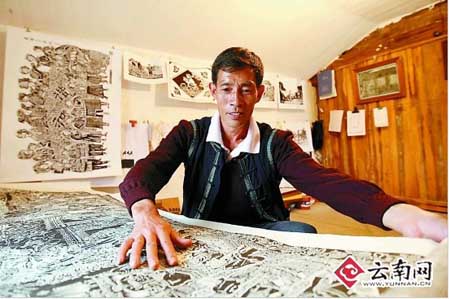11月13日,記者前往采訪時(shí),農(nóng)民版畫家盧正林在自己的版畫工作室翻閱資料,為構(gòu)思新作做著準(zhǔn)備!皼](méi)有想到,我們壯族農(nóng)民創(chuàng)作的20幅版畫能被外交部選定為國(guó)禮,胡錦濤主席出訪時(shí)以個(gè)人名義贈(zèng)予意大利國(guó)家領(lǐng)導(dǎo)人。”盧正林一臉興奮。