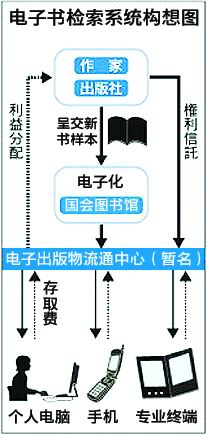 網(wǎng)絡(luò)收費(fèi)圖書(shū)檢索的構(gòu)想源自長(zhǎng)尾真館長(zhǎng)發(fā)表于2008年4月的一項(xiàng)個(gè)人設(shè)想,該設(shè)想最大的亮點(diǎn)便是設(shè)立非盈利的第三方機(jī)構(gòu)“電子出版物流通中心”,全面負(fù)責(zé)與作家的作品網(wǎng)絡(luò)發(fā)布有關(guān)的著作權(quán)問(wèn)題。國(guó)會(huì)圖書(shū)館將藏書(shū)的電子數(shù)據(jù)無(wú)償提供給“電子出版物流通中心”,由該中心以收費(fèi)方式發(fā)送給使用者,隨后將征收到的電子書(shū)存取費(fèi)分配給著作權(quán)人。據(jù)悉,該中心的功能非常近似于眼下“日本音樂(lè)著作權(quán)協(xié)會(huì)”受詞曲作者委托,向電視臺(tái)等征收著作權(quán)使用費(fèi)。
