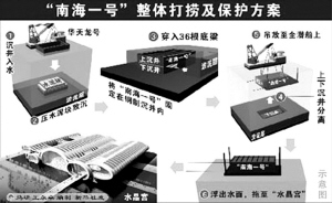 2007年11月13日,工程技術(shù)人員特別是潛水員經(jīng)過60天苦戰(zhàn),終于將已經(jīng)裝有“南海一號”的巨型鋼沉箱的36根底托梁全部穿引完畢,隨后,施工人員在底托梁之間的空當(dāng)穿進37 塊厚度為12毫米的鋼板,使底部密封,以保證起浮時沉箱中的泥沙不會外泄,確保古船不會受到損害。2007年12月22日,隨著“南海一號”整體打撈工程總指揮吳建成一聲令下,廣州打撈局為此次打撈特別定制的4000噸全回轉(zhuǎn)起重船“華天龍”和載重能力1.5萬噸的“重任1601”半潛駁輪一起緩緩把裝載有“南海一號”的沉箱吊出水面。12月23日,在拖輪的牽引護航下,裝載著沉箱和“南海一號”的“重任1601”巨型駁輪被緩緩拉向陽江海陵島的十里銀灘。在那片潔白的沙灘上,新建成的廣東海上絲綢之路博物館(也被稱為“水晶宮”)正在靜靜地等候著它的到來。12月28日,“南海一號”正式入住“水晶宮 ”。至此,“南海一號”整體打撈工作畫上圓滿的句號。