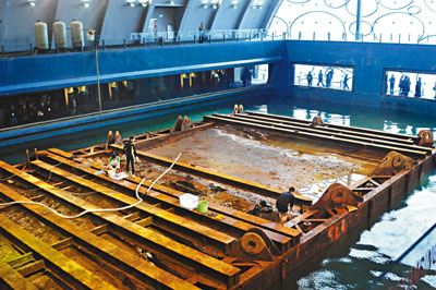 博物館主場(chǎng)南海一號(hào)古船所在的沉箱,考古隊(duì)員正進(jìn)行一場(chǎng)水下考古挖掘的動(dòng)態(tài)演示。經(jīng)過(guò)幾天的放水調(diào)試,沉箱的其中兩個(gè)探方已微露船舷。據(jù)稱(chēng),沉箱仍不會(huì)立即打開(kāi),這是為了保護(hù)古沉船的微環(huán)境。考古人員將采取逐層打開(kāi)的措施,一點(diǎn)一點(diǎn)地發(fā)掘,同時(shí),也有3名蛙人在水下作業(yè)。