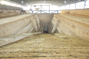 墓地占地面積約800平方米,通過(guò)一個(gè)39.5米的斜坡墓道,直接通到墓室門(mén)口,距離地面15米。如果有一座建筑的話,墓地就位于該建筑的地下五層。