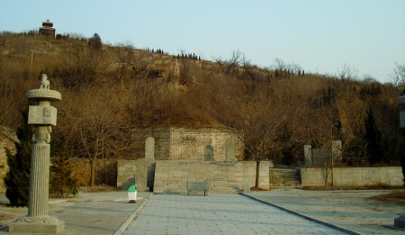 1 月6日,正值今冬最凜冽的天氣,村子里行人稀少,墓園里一片靜寂,兩扇朱紅色大門上面書有“曹植墓”三字,寒風蕭瑟中,倍顯莊嚴肅穆。從側門進入墓園中,一座低矮的山丘佇立,山上挺立的青松之間,各種叢木枝節(jié)盤繞,迎面便是青色古磚砌成的曹植墓。為防止雨水侵蝕,墓門現(xiàn)已經(jīng)封閉,無法進入甬道和墓室。