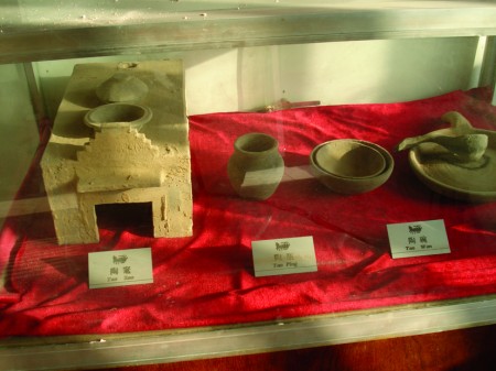進(jìn)入3間墓室,中間墓室的最下層鋪有一指多厚的木炭灰,往上一層鋪著豆粒大小的朱砂,再往上一層是用云母片剪成的日月星形的圖案,云母片上是骨殖,大體骨殖都有,比較完整的有28節(jié),惟缺頭蓋骨。墓中還出土了全套灰陶制作的灶具,另有陶井、陶雞、陶鴨、陶狗、陶鵝等。
