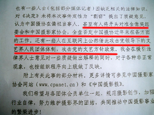怎么可以使用思想如此陳舊的秘書,來起草這樣陳腐的、充滿“階級(jí)斗爭(zhēng)火藥味兒”的協(xié)會(huì)文件?而且,明明是因?yàn)樽约旱氖Р,造成可能在世界攝影史上也不多見的所謂多人聯(lián)合創(chuàng)造照片并且榮獲“金像獎(jiǎng)” 的怪異典型,卻還在責(zé)備別人:“將矛頭對(duì)準(zhǔn)金像獎(jiǎng)組委會(huì)和中國(guó)攝影家協(xié)會(huì),全盤否定中國(guó)攝協(xié)近年來在各方面的工作。還有一些人在互聯(lián)網(wǎng)上公然借機(jī)攻擊黨領(lǐng)導(dǎo)下的文藝界人民團(tuán)體體制,攻擊黨的文藝方針政策!