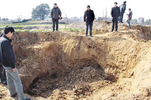 高淳縣文保所的王所長告訴記者,根據(jù)他們的考古經(jīng)驗,和以前工地施工現(xiàn)場的挖掘痕跡比對,這個近千平方米的施工現(xiàn)場,雖然溝壑縱橫,但許多散落其間的坑洞,明顯不是正常施工留下的痕跡,而是使用大型器械專選漢墓室挖掘。