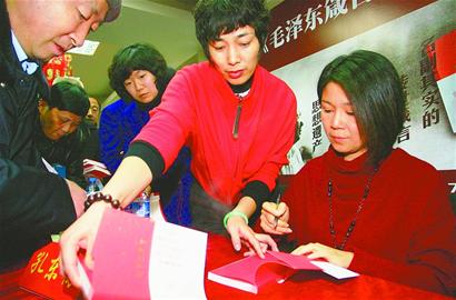3點(diǎn)30分,簽售活動正式開始。人們按照順序,依次走到簽售臺前請孔東梅簽名,有的人還對其表達(dá)著對毛澤東的熱愛之情,有的則和她合影留念。