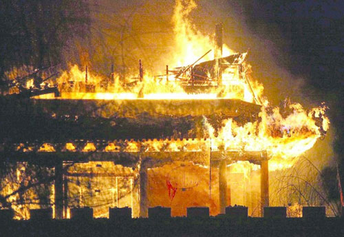 記者從正定縣旅游局及相關(guān)方面了解到,大火起于18日晚8時19分,起火點位于樓閣頂層的飛檐上;鹎榘l(fā)生后,正定消防部門立即出動全力滅火,石家莊的消防部門也趕去支援,現(xiàn)場一度聚集了十六七輛消防車。由于起火點位置較高,加之木質(zhì)結(jié)構(gòu)火勢蔓延較快,救援有些力不從心。大火在燃燒了兩個半小時后被撲滅,此時,城門樓上的兩層樓閣已完全化為灰燼。