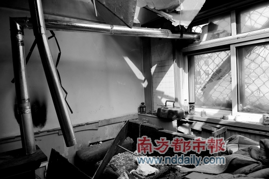 2月23日,正陽藝術(shù)區(qū)值班的藝術(shù)家們,只得圍坐在炭火邊取暖。自2009年11月起,藝術(shù)家們原先租住的房屋已經(jīng)被斷水斷電,而前一天,原先可生爐子居住的維權(quán)辦公室,已被不明身份的人士用大型機械掀去屋頂,房門及窗戶等均被砸爛。