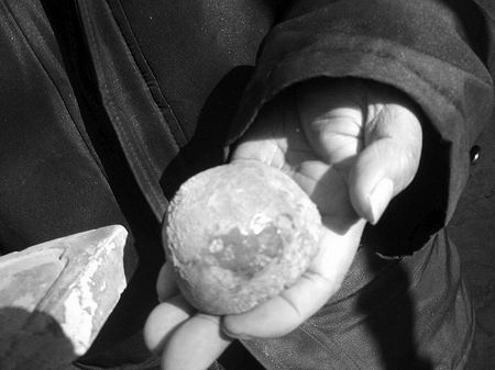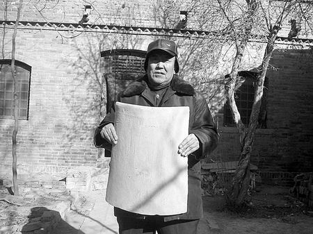 記者在龍振山處不但見到大如饅頭的“門釘”,而且還看到他在西高穴收集的大如簸箕的瓦片,長與下寬足有50多厘米,龍振山持于身前,遮蓋了半個(gè)身子。