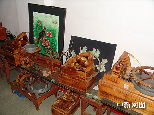 涂祖奕介紹,這些“活寶”名為“水驅(qū)仿古飾物”,是他經(jīng)多年時間,在繼承中國傳統(tǒng)農(nóng)業(yè)水利設(shè)施精華的基礎(chǔ)上,匠心獨運,按照一定的比例微縮精做而成,有微型水碓、水磨、輪碾、水鋸等5個系列40多個品種,均已獲國家專利證書。