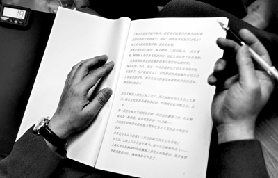 6點(diǎn)15分,接受完媒體采訪,周立波開始為晚上的演出做最后的“沖刺”。助手趕忙遞過一個文件夾,翻開后,周立波向記者展示,“這一次的提綱有點(diǎn)多,大概一兩千字!睖惿锨耙豢,記者發(fā)現(xiàn),這哪是提示綱要啊,完全可以當(dāng)做一份詳盡的講稿。20余頁的A4紙,密密麻麻的文字,一些待會要拋的“包袱 ”一字不差地標(biāo)注在此,用紅黑兩種顏色的斜體字區(qū)隔段落。周立波自言,以往的提綱大概只有兩三百字。單飛后的首演,其重要性不言而喻。