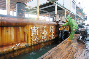 記者尾隨近距離看到,因?yàn)楹I喜龥坝浚⊥г诳拷澳咸祉槨睍r(shí)極其小心,隨后隊(duì)員們相互幫助,一一登上“南天順”。約一個(gè)小時(shí)后,同行的邊防派出所民警離開“南天順”返回碼頭。記者上前了解到,水下考古隊(duì)員當(dāng)晚便開始船上生活。在接下來(lái)的三個(gè)月,他們將一直待在船上,按照計(jì)劃進(jìn)行打撈工作,生活必需品則由民警負(fù)責(zé)運(yùn)送。