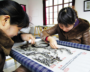 今年“兩會” 期間,溫家寶總理在記者招待會上借《富春山居圖》合璧的話題,表露了華夏兒女期盼祖國統(tǒng)一的心愿。這個信息使江蘇東臺市的工藝美術(shù)工作者大為觸動。因為早在2008年,當(dāng)?shù)氐膬蓚美術(shù)師和8位繡娘歷時9個月曾制作了發(fā)繡作品《富春山居圖》,畫面藍本是原畫的后半部分《無用師卷》,這部作品在當(dāng)年的第八屆中國工藝美術(shù)大師作品暨中國工藝美術(shù)精品博覽會上獲得了金獎。