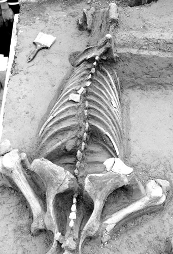 參與發(fā)掘的中國社科院考古所副研究員李存信說,以往發(fā)掘的墓葬中陪葬馬匹一般為側(cè)臥,直立的并不多見。他初步推斷,馬所處的馬槽是專門用于固定馬的站立姿勢的,由于沒有掙扎的痕跡,馬應(yīng)是死后被人卡在槽中,才得以保留了現(xiàn)在的姿勢。