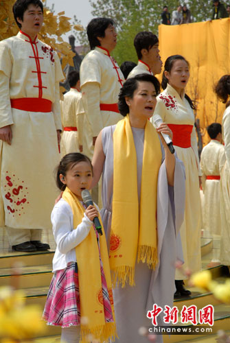 中新網(wǎng)鄭州4月16日電(記者 王中舉)4月16日上午9時(shí)50分,庚寅年黃帝故里拜祖大典將在河南新鄭黃帝故里舉行。北京奧運(yùn)會(huì)開(kāi)幕式演唱《歌唱祖國(guó)》的中國(guó)童星林妙可與中國(guó)著名歌唱家毛阿敏領(lǐng)唱《黃帝頌》,一大一小、和聲共唱,溫馨動(dòng)人的頌歌感動(dòng)了在場(chǎng)的每一位中華兒女。
