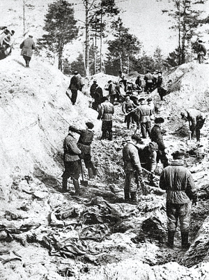1943年4月13日,柏林電臺向全世界報告的一則消息,說在蘇聯(lián)斯摩棱斯克附近的卡廷森林發(fā)現(xiàn)了一批埋有成千上萬波蘭軍官尸體的巨大墳?zāi)梗麄兌际潜蝗擞胁襟E并且熟練地處決的。