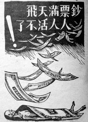 對于通貨膨脹,當(dāng)年老百姓曾這樣描述:國民黨政府發(fā)行的法幣,1937年100元可買到兩頭牛,1938年變?yōu)橐活^牛,1939年可買一頭豬,1941年能買到一袋面粉,1943年能買一只雞,1945年能買一個(gè)煤球,到了1948年,只能買到幾粒大米。