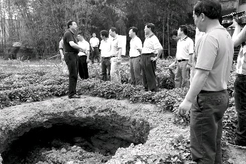 宜賓市長寧縣硐底鎮(zhèn)近日陸續(xù)出現(xiàn)“天坑”,最大的“天坑”直徑4日已經(jīng)擴大到60米,112戶群眾暫時轉移(本報昨日報道)。昨日,宜賓市委常委、常務副市長徐進率宜賓市國土、安監(jiān)、交通等部門前往硐底鎮(zhèn)進行現(xiàn)場查看。據(jù)了解,4日下午,紅旗村再出現(xiàn)一個“天坑”,“天坑”數(shù)量目前增至27個。