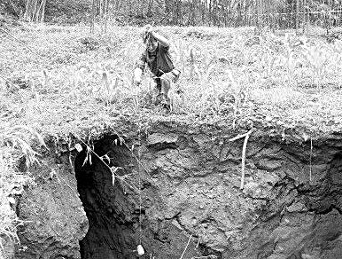 隨著“轟”的一聲巨響,硐底鎮(zhèn)石埡村“大彎頭”出現(xiàn)了一個巨大的坑。巨響后是持續(xù)十多秒的“嘩嘩”聲,那是地層塌陷后,沙石滑到坑底的聲音,每一聲都讓人發(fā)抖、發(fā)冷。