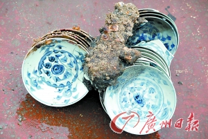 記者了解到,古沉船經(jīng)清淤后現(xiàn)身的3組木質(zhì)隔艙板位于沉船中部,其中一塊已經(jīng)現(xiàn)出約4米長的一段。隔艙板之間,已能夠清晰看到碼放整齊的一摞摞瓷器等文物。成摞瓷器基本上都是側(cè)立橫放并交錯碼放?脊抨(duì)員在水下見到的文物種類主要是青花瓷大盤,也有少量碗、缽、杯及金屬凝結(jié)物。而目前已出水文物主要類型也仍然是外銷瓷器青花瓷大盤、碗、缽、杯、罐、瓶等,此外還有釉陶罐、鐵鍋及銅板等。瓷器的主要產(chǎn)地確定為福建平和窯及江西景德鎮(zhèn)。
