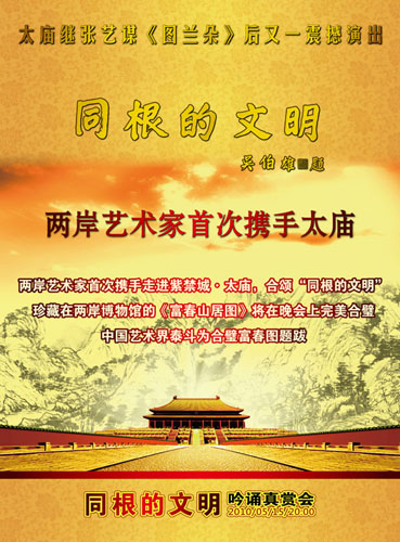 中新網(wǎng)5月13日電 5月15日晚,紫禁城太廟繼張藝謀《圖蘭朵》后即將上演又一震撼文化演出——《同根的文明》吟誦真賞會(huì)。兩岸藝術(shù)家首次攜手走進(jìn)太廟,合頌《同根的文明》,珍藏在兩岸博物館的《富春山居圖》將在演出中實(shí)現(xiàn)完美合璧,中國(guó)藝術(shù)家泰斗為合璧后的《富春山居圖》題跋。